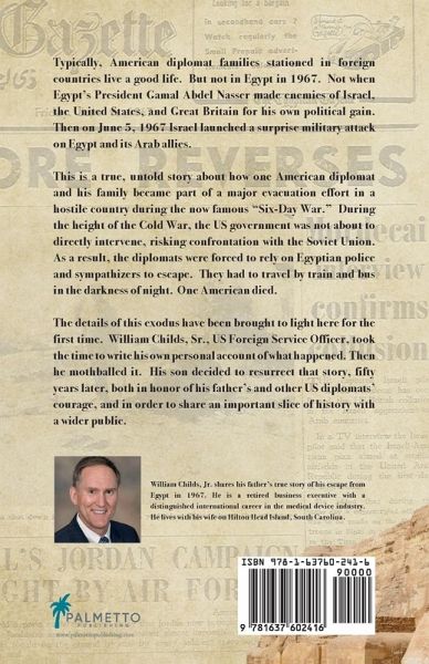 Typically, American diplomat families stationed in foreign countries live a good life. But not in Egypt in 1967. Not when Egypt's President Gamal Abdel Nasser made enemies of Israel, the United States, and Great Britain for his own political gain. Then on June 5, 1967 Israel launched a surprise military attack on Egypt and its Arab allies. This is a true, untold story about how one American diplomat and his family became part of a major evacuation effort in a hostile country during the now famous "Six-Day War." During the height of the Cold War, the US government was not about to directly intervene, risking confrontation with the Soviet Union. As a result, the diplomats were forced to rely on Egyptian police and sympathizers to escape. They had to travel by train and bus in the darkness of night. One American died. The details of this exodus have been brought to light here for the first time. William Childs, Sr., US Foreign Service Officer, took the time to write his own personal account of what happened. Then he mothballed it. His son decided to resurrect that story, fifty years later, both in honor of his father's and other US diplomats' courage, and in order to share an important slice of history with a wider public.
