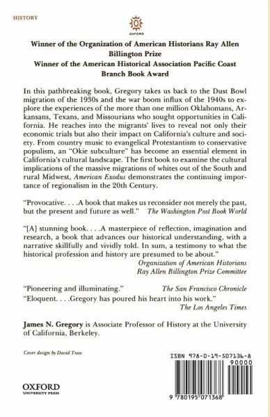 Fifty years ago, John Steinbeck's now classic novel, The Grapes of Wrath, captured the epic story of an Oklahoma farm family driven west to California by dust storms, drought, and economic hardship. It was a story that generations of Americans have also come to know through Dorothea Lange's unforgettable photos of migrant families struggling to make a living in Depression-torn California. Now in James N. Gregory's pathbreaking American Exodus, there is at last an historical study that moves beyond the fiction and the photographs to uncover the full meaning of these events. American Exodus takes us back to the Dust Bowl migration of the 1930s and the war boom influx of the 1940s to explore the experiences of the more than one million Oklahomans, Arkansans, Texans, and Missourians who sought opportunities in California. Gregory reaches into the migrants' lives to reveal not only their economic trials but also their impact on California's culture and society. He traces the development of an "Okie subculture" that over the years has grown into an essential element in California's cultural landscape. The consequences, however, reach far beyond California. The Dust Bowl migration was part of a larger heartland diaspora that has sent millions of Southerners and rural Midwesterners to the nation's northern and western industrial perimeter. American Exodus is the first book to examine the cultural implications of that massive 20th-century population shift. In this rich account of the experiences and impact of these migrant heartlanders, Gregory fills an important gap in recent American social history.
