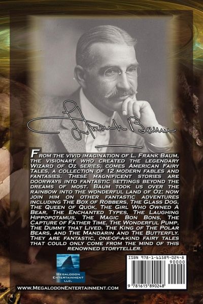 From the vivid imagination of L. Frank Baum, the visionary who created the legendary Wizard of Oz series, comes American Fairy Tales, a collection of 12 modern fables and fantasies. These magnificent stories are doorways into fantastic settings beyond the dreams of most. Baum took us over the rainbow into the wonderful land of Oz; now join him on other fantastic adventures including The Box of Robbers, The Glass Dog, The Queen of Quok, The Girl Who Owned A Bear, The Enchanted Types, The Laughing Hippopotamus, The Magic Bon Bons, The Capture of Father Time, The Wonderful Pump, The Dummy that Lived, The King of The Polar Bears, and The Mandarin and The Butterfly. They are fantastic, one-of-a-kind fairy tales that could only come from the mind of this renowned storyteller.