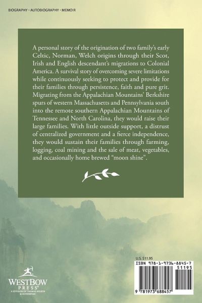 A personal story of the origination of two family's early Celtic, Norman, Welch origins through their Scot, Irish and English descendant's migrations to Colonial America. A survival story of overcoming severe limitations while continuously seeking to protect and provide for their families through persistence, faith and pure grit. Migrating from the Appalachian Mountains' Berkshire spurs of western Massachusetts and Pennsylvania south into the remote southern Appalachian Mountains of Tennessee and North Carolina, they would raise their large families. With little outside support, a distrust of centralized government and a fierce independence, they would sustain their families through farming, logging, coal mining and the sale of meat, vegetables, and occasionally home brewed "moon shine".