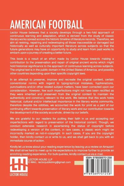 American Football This book is a result of an effort made by us towards making a contribution to the preservation and repair of original classic literature. In an attempt to preserve, improve and recreate the original content, we have worked towards: 1. Type-setting & Reformatting: The complete work has been re-designed via professional layout, formatting and type-setting tools to re-create the same edition with rich typography, graphics, high quality images, and table elements, giving our readers the feel of holding a 'fresh and newly' reprinted and/or revised edition, as opposed to other scanned & printed (Optical Character Recognition - OCR) reproductions. 2. Correction of imperfections: As the work was re-created from the scratch, therefore, it was vetted to rectify certain conventional norms with regard to typographical mistakes, hyphenations, punctuations, blurred images, missing content/pages, and/or other related subject matters, upon our consideration. Every attempt was made to rectify the imperfections related to omitted constructs in the original edition via other references. However, a few of such imperfections which could not be rectified due to intentional\unintentional omission of content in the original edition, were inherited and preserved from the original work to maintain the authenticity and construct, relevant to the work. We believe that this work holds historical, cultural and/or intellectual importance in the literary works community, therefore despite the oddities, we accounted the work for print as a part of our continuing effort towards preservation of literary work and our contribution towards the development of the society as a whole, driven by our beliefs. We are grateful to our readers for putting their faith in us and accepting our imperfections with regard to preservation of the historical content. HAPPY READING!