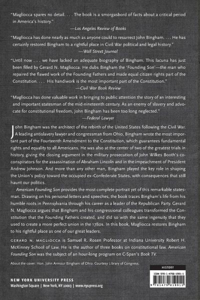 A history of the origins of the 14th Amendment and the the man who helped craft it John Bingham was the architect of the rebirth of the United States following the Civil War. A leading antislavery lawyer and congressman from Ohio, Bingham wrote the most important part of the Fourteenth Amendment to the Constitution, which guarantees fundamental rights and equality to all Americans. He was also at the center of two of the greatest trials in history, giving the closing argument in the military prosecution of John Wilkes Booth's co-conspirators for the assassination of Abraham Lincoln and in the impeachment of President Andrew Johnson. And more than any other man, Bingham played the key role in shaping the Union's policy towards the occupied ex-Confederate States, with consequences that still haunt our politics. American Founding Son provides the most complete portrait yet of this remarkable statesman. Drawing on his personal letters and speeches, the book traces Bingham's life from his humble roots in Pennsylvania through his career as a leader of the Republican Party. Gerard N. Magliocca argues that Bingham and his congressional colleagues transformed the Constitution that the Founding Fathers created, and did so with the same ingenuity that their forbears used to create a more perfect union in the 1780s. In this book, Magliocca restores Bingham to his rightful place as one of our great leaders.