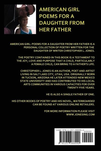 American Girl: Poems For a Daughter From Her Father is a personal collection of poetry written for the daughter of writer Christopher L. Jones. Written over the course of the first eight years of his daughter's life, the poetry contained in this book is a testament to the joy, love and purpose that a child, particularly a female child, can bring to a father's life. Christopher L. Jones is an author, poet and artist living in Salt Lake City, Utah, USA. Originally born in Tucson, Arizona he later attended New Mexico State University and has contributed to his local arts communities in various capacities for over twenty five years. Usually known for his risque style and adult themes, the author here presents a more tender and emotive side of his writing. His other books of poetry and his novel, Waterboarded can be found at various online retailers.