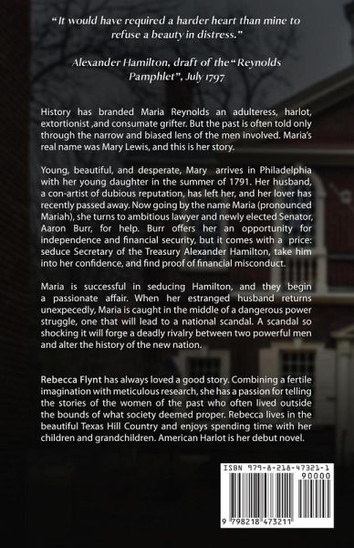 Maria Reynolds. As the infamous mistress of Founding Father Alexander Hamilton, you probably know her name...now read her story. History brands Maria Reynolds an adulteress, harlot, extortionist, and consummate grifter. But the past is often told only through the narrow and biased lens of the men involved. Maria's real name was Mary Lewis, and this is her story. Young, beautiful, and desperate, Mary arrives in Philadelphia with her young daughter in the summer of 1791. Her husband-a con-artist of dubious reputation-has left her, and her lover has recently passed away. Now going by the name Maria (pronounced Mariah), she turns to an ambitious lawyer and newly elected Senator, Aaron Burr, for help. Burr offers her an opportunity for independence and financial security, but it comes with a price: seduce Secretary of the Treasury Alexander Hamilton, take him into her confidence, and find proof of financial misconduct. Maria is successful in seducing Hamilton, and they begin a passionate affair. When her estranged husband returns unexpectedly, Maria is caught in the middle of a dangerous power struggle, one that will lead to a national scandal. A scandal so shocking it will forge a deadly rivalry between two powerful men and alter the history of the new nation.