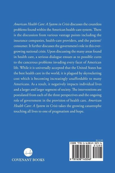American Health Care: A System in Crisis discusses the countless problems found within the American health-care system. There is the discussion from various vantage points including the insurance companies, health-care providers, and the patient/consumer. It further discusses the government's role in this ever-growing national crisis. Upon discussing the many areas found in health care, a serious dialogue ensues as to possible cures to the cancerous problems invading every facet of American life. While it is universally accepted that the United States has the best health care in the world, it is plagued by skyrocketing cost which is becoming increasingly unaffordable to many Americans. As a result, it negatively impacts individual lives and a larger and larger segment of society. The interventions are postulated from each of the three perspectives and the ongoing role of government in the provision of health care. American Health Care: A System in Crisis takes the growing catastrophe touching all lives to one of pragmatism and hope.