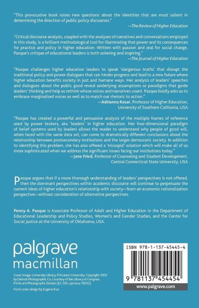"Critical discourse analysis, coupled with the analyses of narratives and conversations employed in this study, is a brilliant methodological tool for illuminating that power and its consequences for practice and policy in higher education. Written with passion and zeal for social change, Pasque's critique of educational leaders is both sobering and inspiring." - Tatiana Suspitsyna, Associate Professor of Educational Studies, The Ohio State University, USA