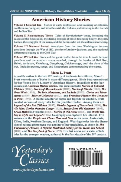 Stories of early exploration and founding of American colonies, conflicts over religion, and troubles with the Indians, culminating in the French and Indian War. Volume 1 in the 4-volume series. Suitable for ages 8 and up.