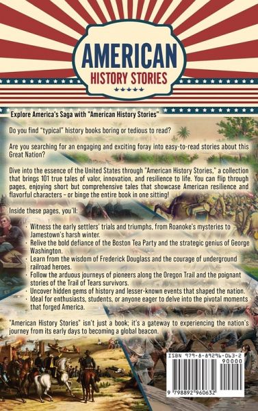¿¿¿¿ Uncover the soul of America with American History Stories! ¿¿¿¿ Embark on an enthralling journey where each story is a thread in the vast tapestry of the United States' legacy. This collection of 101 true tales masterfully narrates the pivotal events and influential figures that have carved the nation's path from its rugged colonial beginnings to its current standing on the world stage. Discover what happened to the early Jamestown settlers, witness the Night of Terror, and explore important and legendary figures in US history such as George Washington and Frederick Douglass. Dive into the unknown: Discover tales of early settlers and their harrowing experiences, shedding light on the less traveled paths of American history. Witness groundbreaking moments: From the drafting of the Declaration of Independence to the monumental civil rights struggles, be a part of the events that shaped the nation. Meet the legends: Get up close with figures like George Washington and Frederick Douglass, understanding their roles beyond the textbooks. Uncover hidden stories: Learn about the first woman executed in the United States and the true story behind the sack of Lawrence. Embark on a journey of resilience: Through trials and triumphs, explore how the United States emerged from adversity to become a beacon of freedom and progress. Experience history firsthand: Feel the emotions and motivations that drove individuals and communities to fight for their beliefs and shape a nation. American History Stories doesn't just recount history; it immerses you in it.