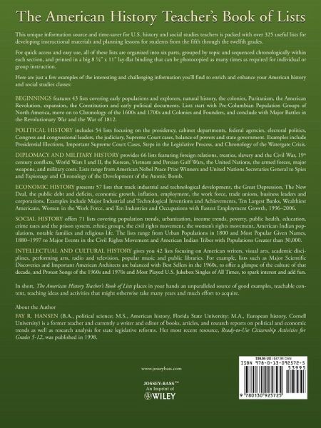 This unique information source and time-saver for U.S. history and social studies teachers is packed with over 325 useful lists for developing instructional materials and planning lessons for students from the fifth through the twelfth grades. For quick access and easy use, all of these lists are organized into six parts, grouped by topic and sequenced chronologically within each section, and printed in a big 81/2" x 11" lay-flat binding that can be photocopied as many times as required for individual or group instruction. Here are just a few examples of the interesting and challenging information you'll find to enrich and enhance your American history and social studies classes: Beginnings features 43 lists covering early populations and explorers, natural history, the colonies, Puritanism, the American Revolution, expansion, the Constitution and early political documents. Lists start with Pre-Columbian Population Groups of North America, move on to Chronology of the 1600s and 1700s and Colonies and Founders, and conclude with Major Battles in the Revolutionary War and the War of 1812. Political History includes 54 lists focusing on the presidency, cabinet departments, federal agencies, electoral politics, Congress and congressional leaders, the judiciary, Supreme Court cases, balance of powers and state government. Examples include Presidential Elections, Important Supreme Court Cases, Steps in the Legislative Process, and Chronology of the Watergate Crisis. Diplomacy and Military History provides 66 lists featuring foreign relations, treaties, slavery and the Civil War, 19th century conflicts, World Wars I and II, the Korean, Vietnam and Persian Gulf Wars, the United Nations, the armed forces, major weapons, and military costs. Lists range from American Nobel Peace Prize Winners and United Nations Secretaries General to Spies and Espionage and Chronology of the Development of the Atomic Bomb. Economic History presents 57 lists that track industrial and technological development, the Great Depression, The New Deal, the public debt and deficits, economic growth, inflation, employment, the work force, trade unions, business leaders and corporations. Examples include Major Industrial and Technological Inventions and Achievements, Ten Largest Banks, Wealthiest Americans, Women in the Work Force, and Ten Industries and Occupations with Fastest Employment Growth, 1996--2006. Social History offers 71 lists covering population trends, urbanization, income trends, poverty, public health, education, crime rates and the prison system, ethnic groups, the civil rights movement, the women's rights movement, American Indian populations, notable families and religious life. The lists range from Urban Populations in 1800 and Most Popular Given Names, 1880--1997 to Major Events in the Civil Rights Movement and American Indian Tribes with Populations Greater than 30,000. Intellectual and Cultural History gives you 42 lists focusing on American writers, visual arts, academic disciplines, performing arts, radio and television, popular music and public libraries. For example, lists such as Major Scientific Discoveries and Important American Architects are balanced with Best Sellers in the 1960s, to offer a glimpse of the culture of that decade, and Protest Songs of the 1960s and 1970s and Most Played U.S. Jukebox Singles of All Times, to spark interest and add fun. In short, The American History Teacher's Book of Lists places in your hands an unparalleled source of good examples, teachable content, teaching ideas and activities that might otherwise take many years and much effort to acquire.