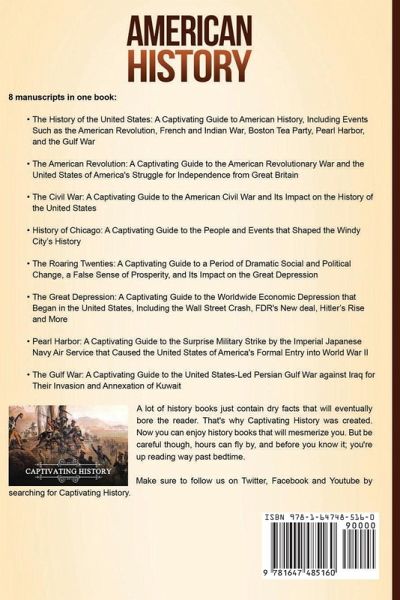 If you want to discover the captivating history of the United States of America, then keep reading... Eight captivating manuscripts in one book: The History of the United States: A Captivating Guide to American History, Including Events Such as the American Revolution, French and Indian War, Boston Tea Party, Pearl Harbor, and the Gulf War The American Revolution: A Captivating Guide to the American Revolutionary War and the United States of America's Struggle for Independence from Great Britain The Civil War: A Captivating Guide to the American Civil War and Its Impact on the History of the United States History of Chicago: A Captivating Guide to the People and Events that Shaped the Windy City’s History The Roaring Twenties: A Captivating Guide to a Period of Dramatic Social and Political Change, a False Sense of Prosperity, and Its Impact on the Great Depression The Great Depression: A Captivating Guide to the Worldwide Economic Depression that Began in the United States, Including the Wall Street Crash, FDR's New deal, Hitler’s Rise and More Pearl Harbor: A Captivating Guide to the Surprise Military Strike by the Imperial Japanese Navy Air Service that Caused the United States of America's Formal Entry into World War II The Gulf War: A Captivating Guide to the United States-Led Persian Gulf War against Iraq for Their Invasion and Annexation of Kuwait Some of the topics covered in part 1 of this book include: The People Who Were There First A Time of Exploration And much, much more! Some of the topics covered in part 2 of this book include: Colonial America The Seven Years’ War and Its Consequences Taxation Without Representation And much, much more! In part 3 of this book, you will: An Uneasy Nation The Foundation Cracks And much, much more! Some of the topics covered in part 4 of this book include: The Chicago Trail of Tears All Roads (and Railways) Lead to Chicago And much, much more! Some of the topics covered in part 6 of this book include: Causes of the Great Depression 1918-1929 Herbert Hoover and the Early Years of the Depression And much, much more! Some of the topics covered in part 7 of this book include: The Pearl Harbor Naval Base, Pre-1941 Post-World War I Pearl Harbor And much, much more! Some of the topics covered in part 8 of this book include: Iraqi-Kuwaiti Relations and the Prelude to the War Circumstances and Causes of the Gulf Conflic And much, much more! So if you want to learn more about the captivating history of the United States of America, scroll up and click the "add to cart" button!