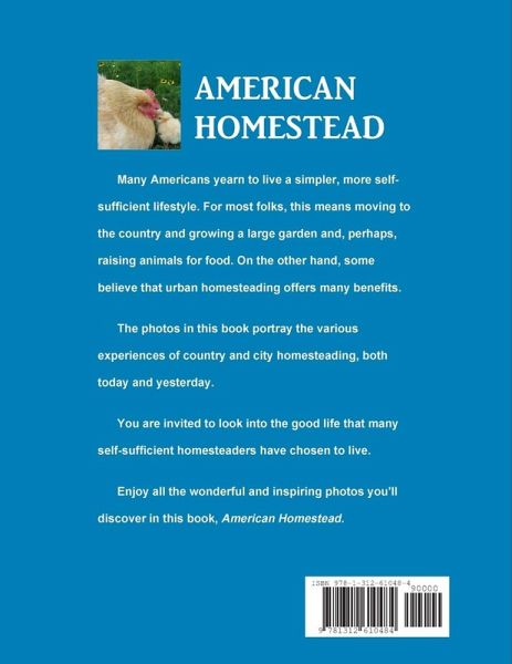 AMERICAN HOMESTEAD: Many Americans yearn to live a simpler, more self-sufficient lifestyle. For most folks, this means moving to the country and growing a large garden and, perhaps, raising animals for food. On the other hand, some believe that urban homesteading offers many benefits. The photos in this book portray the various experiences of country and city homesteading, both today and yesterday. You are invited to look into the good life that many self-sufficient homesteaders have chosen to live. Enjoy all the wonderful and inspiring photos you'll discover in this book, American Homestead.