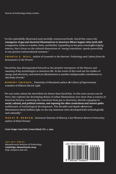 How Americans adapted European royal illuminations for patriotic celebrations, spectacular expositions, and intensely bright commercial lighting to create the world's most dazzling and glamorous cities. Illuminated fêtes and civic celebrations began in Renaissance Italy and spread through the courts of Europe. Their fireworks, torches, lamps, and special effects glorified the monarch, marked the birth of a prince, or celebrated military victory. Nineteenth-century Americans rejected such monarchial pomp and adapted spectacular lighting to their democratic, commercial culture. In American Illuminations, David Nye explains how they experimented with gas and electric light to create illuminated cityscapes far brighter and more dynamic than those of Europe, and how these illuminations became symbols of modernity and the conquest of nature. Americans used gaslight and electricity in parades, expositions, advertising, elections, and political spectacles. In the 1880s, cities erected powerful arc lights on towers to create artificial moonlight. By the 1890s they adopted more intensive, commercial lighting that defined distinct zones of light and glamorized the city's White Ways, skyscrapers, bridges, department stores, theaters, and dance halls. Poor and blighted areas disappeared into the shadows. American illuminations also became integral parts of national political campaigns, presidential inaugurations, and victory celebrations after the Spanish-American War and World War I.