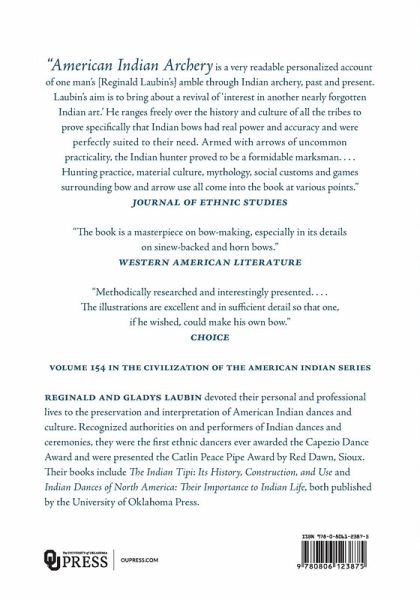 "American Indian Archery is a very readable personalized account of one man's amble through Indian archery, past and present. Laubin's aim is to bring about a revival of 'interest in another nearly forgotten Indian art.' He ranges freely over the history and culture of all the tribes to prove specifically that Indian bows had real power and accuracy, and were perfectly suited to their need. Armed with arrows of uncommon practicality, the Indian hunter proved to be a formidable marksman. . . .Hunting practice, material culture, mythology, social customs and games surrounding bow and arrow use all come into the book at various point."-Journal of Ethnic Studies. "A methodically researched and interestingly presented work, whose title does not do credit to its contents. There are chapters on comparison of bows, making of bows, making of arrows, and comparisons between Indian and English archery. The illustrations are excellent and in sufficient detail so that one if he wished could make his own bow."-Choice. "It is evident that the book is a masterpiece on bow-making, especially in its details on sinew-backed and horn bows."-Western American Literature.