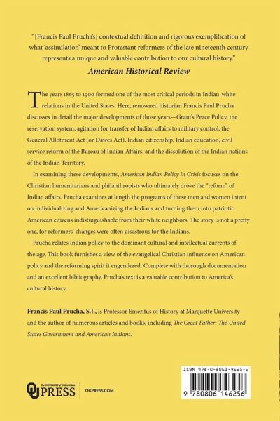 "[Francis Paul Prucha's] contextual definition and rigorous exemplification of what 'assimilation' meant to Protestant reformers of the late nineteenth century represents a unique and valuable contribution to our cultural history." American Historical Review The years 1865 to 1900 formed one of the most critical periods in Indian-white relations in the United States. Here, renowned historian Francis Paul Prucha discusses in detail the major developments of those years-Grant's Peace Policy, the reservation system, agitation for transfer of Indian affairs to military control, the General Allotment Act (or Dawes Act), Indian citizenship, Indian education, civil service reform of the Bureau of Indian Affairs, and the dissolution of the Indian nations of the Indian Territory. In examining these developments, American Indian Policy in Crisis focuses on the Christian humanitarians and philanthropists who ultimately drove the "reform" of Indian affairs. Prucha examines at length the programs of these men and women intent on individualizing and Americanizing the Indians and turning them into patriotic American citizens indistinguishable from their white neighbors. The story is not a pretty one, for reformers' changes were often disastrous for the Indians, and yet this is a tremendously important work for understanding the Indians' situation and their place in American society today. Prucha does not treat Indian policy in isolation but relates it to the dominant cultural and intellectual currents of the age. This book furnishes a view of the evangelical Christian influence on American policy and the reforming spirit it engendered, both of which have a significance extending beyond Indian policy. Complete with thorough documentation and an excellent bibliography, Prucha's text is a valuable contribution to America's cultural history. Francis Paul Prucha, S.J., is Professor Emeritus of History at Marquette University and the author of numerous articles and books, including The Great Father: The United States Government and American Indians.