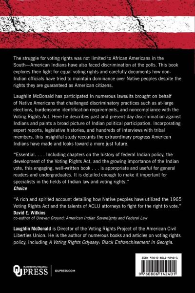 Recounting Indians' progress in the voting booth The struggle for voting rights was not limited to African Americans in the South. American Indians also faced discrimination at the polls and still do today. This book explores their fight for equal voting rights and carefully documents how non-Indian officials have tried to maintain dominance over Native peoples despite the rights they are guaranteed as American citizens. Laughlin McDonald has participated in numerous lawsuits brought on behalf of Native Americans in Montana, Colorado, Nebraska, South Dakota, and Wyoming. This litigation challenged discriminatory election practices such as at-large elections, redistricting plans crafted to dilute voting strength, unfounded allegations of election fraud on reservations, burdensome identification and registration requirements, lack of language assistance, and noncompliance with the Voting Rights Act. McDonald devotes special attention to the VRA and its amendments, whose protections are central to realizing the goal of equal political participation. McDonald describes past and present-day discrimination against Indians, including land seizures, destruction of bison herds, attempts to eradicate Native language and culture, and efforts to remove and in some cases even exterminate tribes. Because of such treatment, he argues, Indians suffer a severely depressed socioeconomic status, voting is sharply polarized along racial lines, and tribes are isolated and lack meaningful interaction with non-Indians in communities bordering reservations. Far more than a record of litigation, American Indians and the Fight for Equal Voting Rights paints a broad picture of Indian political participation by incorporating expert reports, legislative histories, newspaper accounts, government archives, and hundreds of interviews with tribal members. This in-depth study of Indian voting rights recounts the extraordinary progress American Indians have made and looks toward a more just future. Laughlin McDonald is Director of the Voting Rights Project of the American Civil Liberties Union. He is the author of numerous books and articles on voting rights policy, including A Voting Rights Odyssey: Black Enfranchisement in Georgia