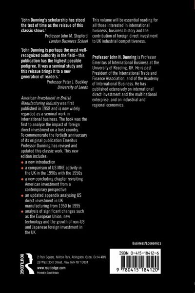 This classic work, first published in 1958, is a seminal text in international business history. This new, substantially updated and revised edition is being published on the fortieth anniversary of the first edition. Features of the revised edition include: * a new introduction * a new concluding chapter * amendments and additions to the original text * a new statistical appendix which examines the main features and significance of the US penetration of UK industry over the past four decades. Professor Dunning is one of the most internationally renowned and respected scholars in international business research. The updated version of this highly regarded book is a major contribution to studies in international business history.