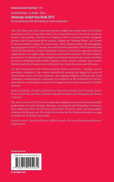 This Year Book, now in its 115th year, provides insight into major trends in the North American Jewish communities and is the Annual Record of the North American Jewish Communities. The first two chapters of Part I examine Jewish immigrant groups to the US and Jewish life on campus. Chapters on "National Affairs" and "Jewish Communal Affairs" analyze the year's events. Three chapters analyze the demography and geography of the US, Canada, and world Jewish populations. Part II provides Jewish Federations, Jewish Community Centers, social service agencies, national organizations, overnight camps, museums, and Israeli consulates. The final chapters present national and local Jewish periodicals and broadcast media; academic resources, including Jewish Studies Programs, books, articles websites, and research libraries; and lists of major events in the past year, Jewish honorees, and obituaries.