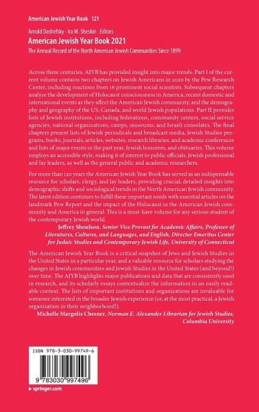 Across three centuries, AJYB has provided insight into major trends. Part I of the current volume contains two chapters on Jewish Americans in 2020 by the Pew Research Center, including reactions from 16 prominent social scientists. Subsequent chapters analyze the development of Holocaust consciousness in America, recent domestic and international events as they affect the American Jewish community, and the demography and geography of the US, Canada, and world Jewish populations. Part II provides lists of Jewish institutions, including federations, community centers, social service agencies, national organizations, camps, museums, and Israeli consulates. The final chapters present lists of Jewish periodicals and broadcast media, Jewish Studies programs, books, journals, articles, websites, research libraries, and academic conferences and lists of major events in the past year, Jewish honorees, and obituaries. This volume employs an accessible style, making it of interest to public officials, Jewish professional and lay leaders, as well as the general public and academic researchers.
