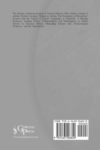 The historic American Journal of Ancient History. This volume contains 3 articles: Pericles Georges, 'Darius in Scythia: The Formation of Herodotus' Sources and the Nature of Darius' Campaign', J. Linderski, 'A Missing Ponticus', Stephan Podes, 'Ekklesiastikon and Participation in Public Service in Classical Athens: Misleading Literary and Archaeological Evidence - and the Alternative?'.