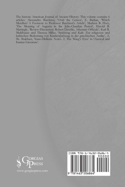 The historic American Journal of Ancient History. This volume contains 6 articles: Alessandro Barchiesi, 'Ovid the Censor', E. Badian, 'Which Metellus? A Footnote to Professor Barchiesi's Article', Marleen B. Flory, 'The Meaning of Augusta in the Julio-Claudian Period', Harold B. Mattingly, 'Review-Discussion: Robert Develin, Athenian Officials', Karl R. Muhlbauer und Theresa Miller, 'Spielzeug und Kult. Zur religiosen und kultischen Bedeutung von Kinderspielzeug in der griechischen Antike', A. Sh. Shahbazi, 'Irano-Hellenic Notes. 2. The 'King's Eyes' in Classical and Iranian Literature'.