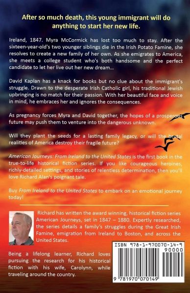 After so much death, this young immigrant will do anything to start her new life. Ireland, 1847. Myra McCormick has lost too much to stay. After the sixteen-year-old's two younger siblings die in the Irish Potato Famine, she resolves to create a new family of her own. As she emigrates to America, she meets a college student who's both handsome and the perfect candidate to let her live out her new dream… David Kaplan has a knack for books but no clue about the immigrant's struggle. Drawn to the desperate Irish Catholic girl, his traditional Jewish upbringing is no match for their passion. With her beautiful face and voice in mind, he embraces her and ignores the consequences. As pregnancy forces Myra and David together, the hopes of a prosperous future may push them to venture into the dangerous unknown. Will they plant the seeds for a lasting family legacy, or will the brutal realities of America destroy their fragile future? American Journeys: From Ireland to the United States is the first book in the true-to-life historical fiction series. If you like courageous heroines, richly-detailed settings, and stories of relentless determination, then you’ll love Richard Alan's poignant tale. Buy From Ireland to the United States to embark on an emotional journey today!