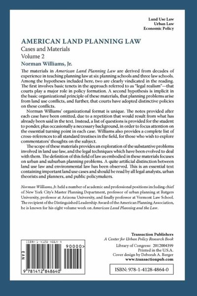 The materials in American Land Planning Law are derived from decades of experience in teaching planning law at six planning schools and three law schools. Among the hypotheses included here, two are clearly vindicated in the reading. The first involves basic tenets in the approach referred to as "legal realism" - that courts play a major role in policy formation. A second hypothesis is implicit in the basic organizational principle of these materials, that planning problems arise from land use conflicts, and further, that courts have adopted distinctive policies on these conflicts.Norman Williams' organizational format is unique. The notes provided after each case have been omitted, due to a repetition that would result from what has already been said in the text. Instead, a list of questions is provided for the student to ponder, plus occasionally a necessary background, in order to focus attention on the essential turning point in each case. Williams also provides a complete list of cross-references to all standard treatises in the field, for those who wish to explore commentators' thoughts on the subject.The scope of these materials provides an exploration of the substantive problems involved in land use law, and the legal techniques which have been evolved to deal with them. The definition of this field of law as embodied in these materials focuses on urban and suburban planning problems. A quite artificial distinction between land use law and environmental law has been observed. This is an essential text containing important land use cases and should be read by all legal analysts, urban theorists and planners, and public policymakers.