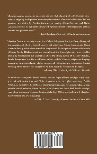 The 1780s and 1790s were a critical era for communities of colour in the new United States of America. Even Thomas Jefferson observed that in the aftermath of the American Revolution, "the spirit of the master is abating, that of the slave rising from the dust." This book explores the means by which the very first Black and Indian authors rose up to transform their communities and the course of American literary history. It argues that the origins of modern African-American and American Indian literatures emerged at the revolutionary crossroads of religion and racial formation as early Black and Indian authors reinvented American evangelicalism and created new postslavery communities, new categories of racial identification, and new literary traditions. While shedding fresh light on the pioneering figures of African-American and Native American cultural history--including Samson Occom, Prince Hall, Richard Allen, Absalom Jones, and John Marrant--this work also explores a powerful set of little-known Black and Indian sermons, narratives, journals, and hymns. Chronicling the early American communities of color from the separatist Christian Indian settlement in upstate New York to the first African Lodge of Freemasons in Boston, it shows how eighteenth-century Black and Indian writers forever shaped the American experience of race and religion. American Lazarus offers a bold new vision of a foundational moment in American literature. It reveals the depth of early Black and Indian intellectual history and reassesses the political, literary, and cultural powers of religion in America.
