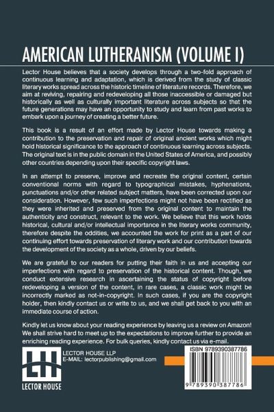 American Lutheranism (Volume I): Early History Of American Lutheranism And The Tennessee Synod This book is a result of an effort made by us towards making a contribution to the preservation and repair of original classic literature. In an attempt to preserve, improve and recreate the original content, we have worked towards: 1. Type-setting & Reformatting: The complete work has been re-designed via professional layout, formatting and type-setting tools to re-create the same edition with rich typography, graphics, high quality images, and table elements, giving our readers the feel of holding a 'fresh and newly' reprinted and/or revised edition, as opposed to other scanned & printed (Optical Character Recognition - OCR) reproductions. 2. Correction of imperfections: As the work was re-created from the scratch, therefore, it was vetted to rectify certain conventional norms with regard to typographical mistakes, hyphenations, punctuations, blurred images, missing content/pages, and/or other related subject matters, upon our consideration. Every attempt was made to rectify the imperfections related to omitted constructs in the original edition via other references. However, a few of such imperfections which could not be rectified due to intentional\unintentional omission of content in the original edition, were inherited and preserved from the original work to maintain the authenticity and construct, relevant to the work. We believe that this work holds historical, cultural and/or intellectual importance in the literary works community, therefore despite the oddities, we accounted the work for print as a part of our continuing effort towards preservation of literary work and our contribution towards the development of the society as a whole, driven by our beliefs. We are grateful to our readers for putting their faith in us and accepting our imperfections with regard to preservation of the historical content. HAPPY READING!