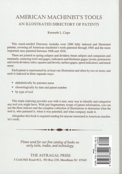 A valuable directory that illustrates and lists over 1000 fully-indexed patents, covering all American machinist s tools patented through 1905 and the more important ones patented between 1906 and 1916. Each patent is represented by at least one illustration, and each is indexed in three separate ways: alphabetically by patentee name, chronologically by date and patent number, and by type of tool. Required for anyone interested in American machinist s tools.