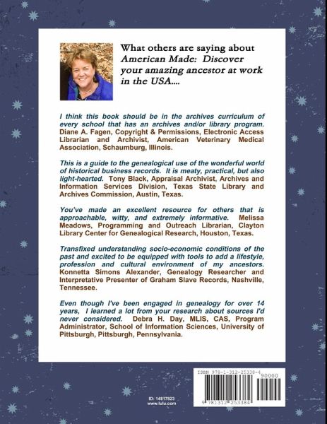 American Made: Discover your amazing ancestor at work in the USA is a light-hearted guide designed to help beginning Genealogists find ancestors using historical documents created by and about American business. American Made enlightens the reader about how historical business documents are used to prove one's pedigree and paint a colorful backstory. The guide further teaches the reader about the vast array of primary and secondary business sources available for the hunt. Most importantly, the reader learns where and how to find the good stuff, in repositories entrusted with preserving business sources online and off. American Made contains an extensive bibliography of chiefly digital sources to help the Genealogist begin the search. A tale of trial, torment, and triumph await the reader whose ancestor left a work life paper trail in search of the American Dream in American Made.