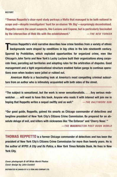 "Reppetto's book earns its place among the best . . . he brings fresh context to a familiar story worth retelling." -The New York Times Book Review Organized crime-the Italian American kind-has long been a source of popular entertainment and legend. Now Thomas Reppetto provides a balanced history of the Mafia's rise-from the 1880s to the post-WWII era-that is as exciting and readable as it is authoritative. Structuring his narrative around a series of case histories featuring such infamous characters as Lucky Luciano and Al Capone, Reppetto draws on a lifetime of field experience and access to unseen documents to show us a locally grown Mafia. It wasn't until the 1920s, thanks to Prohibition, that the Mafia assumed what we now consider its defining characteristics, especially its octopuslike tendency to infiltrate industry and government. At mid-century the Kefauver Commission declared the Mafia synonymous with Union Siciliana; in the 1960s the FBI finally admitted the Mafia's existence under the name La Cosa Nostra. American Mafia is a fascinating look at America's most compelling criminal subculture from an author who is intimately acquainted with both sides of the street.