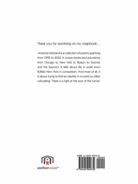 American Mohawk is a collection of poems spanning from 1995 to 2003. It covers travels and excursions from Chicago to New York to Boston to Toronto and the beyond. It talks about life in small town Buffalo New York in comparison. And most of all, it is about trying to find an identity in a world so often calculating. There is a light at the end of the tunnel.