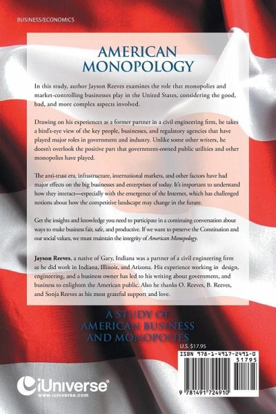 In this study, author Jayson Reeves examines the role that monopolies and market-controlling businesses play in the United States, considering the good, bad, and more complex aspects involved. Drawing on his experiences as a former partner in a civil engineering firm, he takes a bird's-eye view of the key people, businesses, and regulatory agencies that have played major roles in government and industry. Unlike some other writers, he doesn't overlook the positive part that government-owned public utilities and other monopolies have played. The anti-trust era, infrastructure, international markets, and other factors have had major effects on the big businesses and enterprises of today. It's important to understand how they interact-especially with the emergence of the Internet, which has challenged notions about how the competitive landscape may change in the future. Get the insights and knowledge you need to participate in a continuing conversation about ways to make business fair, safe, and productive. If we want to preserve the Constitution and our social values, we must maintain the integrity of American Monopology.