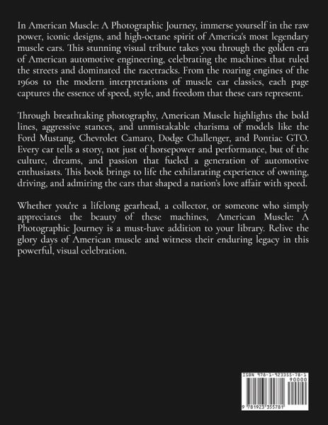 In American Muscle: A Photographic Journey, immerse yourself in the raw power, iconic designs, and high-octane spirit of America's most legendary muscle cars. This stunning visual tribute takes you through the golden era of American automotive engineering, celebrating the machines that ruled the streets and dominated the racetracks. From the roaring engines of the 1960s to the modern interpretations of muscle car classics, each page captures the essence of speed, style, and freedom that these cars represent. Through breathtaking photography, American Muscle highlights the bold lines, aggressive stances, and unmistakable charisma of models like the Ford Mustang, Chevrolet Camaro, Dodge Challenger, and Pontiac GTO. Every car tells a story, not just of horsepower and performance, but of the culture, dreams, and passion that fueled a generation of automotive enthusiasts. This book brings to life the exhilarating experience of owning, driving, and admiring the cars that shaped a nation's love affair with speed. Whether you're a lifelong gearhead, a collector, or someone who simply appreciates the beauty of these machines, American Muscle: A Photographic Journey is a must-have addition to your library. Relive the glory days of American muscle and witness their enduring legacy in this powerful, visual celebration.