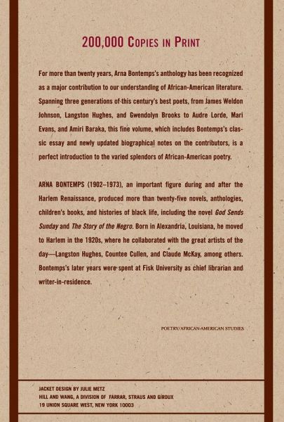 With 200,000 copies in print, this anthology has for decades been seen as a fundamental collection of African-American verse. Bontemps (1902-73), an important figure during and after the Harlem Renaissance, author of more than 25 novels, and longtime librarian at Fisk University, last revised this classic anthology just before his death, adding such crucial new voices as Audre Lorde, Nikki Giovanni, and Bob Kaufman, among others. This edition, issued in 1996, reprints the poems in Bontemps's revised volume along with updated biographical notes. Nearly seventy poets are represented, their works indexed by both author and title.