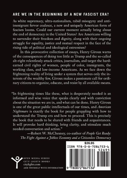"In frightening times like these, what is desperately needed is an informed and wise voice that speaks clearly and with conviction about the situation we are in, and what can be done. Henry Giroux is one of the great public intellectuals of our times, and American Nightmare is exactly the book for people grappling with how to understand the Trump era and how to proceed. This is precisely the book that needs to be shared with friends and acquaintances. It will provoke hard thinking, bring clarity, and stimulate much needed conversation and action."-Robert W. McChesney, co-author of People Get Ready: The Fight Against a Jobless Economy and a Citizenless Democracy