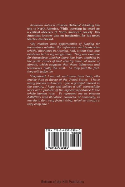 American Notes is Charles Dickens' detailing his trip to North America. While traveling he acted as a critical observer of North American society. His American journey was an inspiration for his novel Martin Chuzzlewit. "My readers have opportunities of judging for themselves whether the influences and tendencies which I distrusted in America, had, at that time, any existence but in my imagination. They can examine for themselves whether there has been anything in the public career of that country since, at home or abroad, which suggests that those influences and tendencies really did exist. As they find the fact, they will judge me. "Prejudiced, I am not, and never have been, otherwise than in favour of the United States. I have many friends in America, I feel a grateful interest in the country, I hope and believe it will successfully work out a problem of the highest importance to the whole human race. To represent me as viewing AMERICA with ill-nature, coldness, or animosity, is merely to do a very foolish thing: which is always a very easy one."