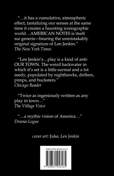 A kaleidoscopic, surrealistic overview of contemporary America, set forth in the bizarre, highly theatrical style which characterizes this writer's distinctive voice. Produced by New York's highly regarded Public Theater, the play employs brilliantly imaginative avante-garde techniques to highlight both the dreams - and delusions - which infuse and motivate our modern world. The play is made up of a series of concurrent actions, some set in a tacky motel, some elsewhere, involving a group of disparate but curiously related people. There is the young night clerk, Pauline, who studies her high-school English Lit notebook, while growing increasingly fearful of the unseen and unwanted suitor who lies in wait in the motel parking lot; a raucous carnival barker touting his giant crocodile, Bonecrusher; a pair of seedy bar denizens who occasionally break into song; a dim-witted handyman, Chuckles, who performs pointless errands; a deranged scientist who believes that he is in contact with creatures from outer space; an abandoned woman who waits restlessly for a lover who will probably never return; and a mysterious drifter, Faber, who, somehow becomes the catalyst which fuses all these divergent elements into a cohesive, and often wildly funny whole. And, in so doing, makes the play both an encapsulation of the American myth and, at the same time, a telling comment on what is right - and wrong - with this myth. "... it has a cumulative, atmospheric effect, tantalizing our senses at the same time it creates a haunting iconographic world ... AMERICAN NOTES is itself sui generis - bearing the unmistakably original signature of Len Jenkin." -The New York Times "[AMERICAN NOTES] is a kind of anti-OUR TOWN. The weird backwater in which it's set is a little surreal and a lot seedy, populated by nighthawks, drifters, pimps, and hucksters." -Chicago Reader "Twice as ingeniously written as any play in town ..." -The Village Voice "... a mythic vision of America ..." -Drama-Logue
