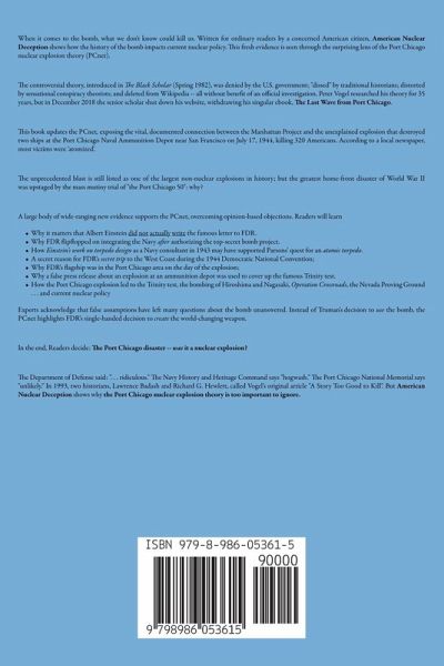 When it comes to the bomb, what we don't know could kill us. Written for ordinary readers by a concerned American citizen, American Nuclear Deception shows how the history of the bomb impacts current nuclear policy. This fresh evidence is seen through the surprising lens of the Port Chicago nuclear explosion theory (PCnet). The controversial theory, introduced in The Black Scholar (Spring 1982), was denied by the U.S. government; "dissed" by traditional historians; distorted by sensational conspiracy theorists; and deleted from Wikipedia -- all without benefit of an official investigation. Peter Vogel researched his theory for 35 years, but in December 2018 the senior scholar shut down his website, withdrawing his singular ebook, The Last Wave from Port Chicago. This book updates the PCnet, exposing the vital, documented connection between the Manhattan Project and the unexplained explosion that destroyed two ships at the Port Chicago Naval Ammunition Depot near San Francisco on July 17, 1944, killing 320 Americans. According to a local newspaper, most victims were 'atomized'. The unprecedented blast is still listed as one of the largest non-nuclear explosions in history; but the greatest home-front disaster of World War II was upstaged by the mass mutiny trial of "the Port Chicago 50": why? A Naval board ruled that the cause could never be determined -- but one of the three men on the board, Capt John Crenshaw, was related to Capt William S. Parsons, the man responsible for producing the bomb. Crenshaw was with Parsons on July 20, 1944, when he led his research team to Port Chicago to study "the effects of the detonation." A large body of wide-ranging new evidence supports the PCnet, overcoming opinion-based objections. Readers will learnWhy it matters that Albert Einstein did not actually write the famous letter to FDR. Why FDR flipflopped on integrating the Navy after authorizing the top-secret bomb project. How Einstein's work on torpedo design as a Navy consultant in 1943 may have supported Parsons' quest for an atomic torpedo. A secret reason for FDR's secret trip to the West Coast during the 1944 Democratic National Convention; Why FDR's flagship was in the Port Chicago area on the day of the explosion; Why a false press release about an explosion at an ammunition depot was used to cover up the famous Trinity test. How the Port Chicago explosion led to the Trinity test, the bombing of Hiroshima and Nagasaki, Operation Crossroads, the Nevada Proving Ground . . . and current nuclear policy Experts acknowledge that false assumptions have left many questions about the bomb unanswered. Instead of Truman's decision to use the bomb, the PCnet highlights FDR's single-handed decision to create the world-changing weapon. In the end, Readers decide: The Port Chicago disaster -- was it a nuclear explosion? The Department of Defense said: ". . . ridiculous." The Navy History and Heritage Command says "hogwash." The Port Chicago National Memorial says "unlikely." In 1993, two historians, Lawrence Badash and Richard G. Hewlett, called Vogel's original article "A Story Too Good to Kill". But American Nuclear Deception shows why the Port Chicago nuclear explosion theory is too important to ignore.