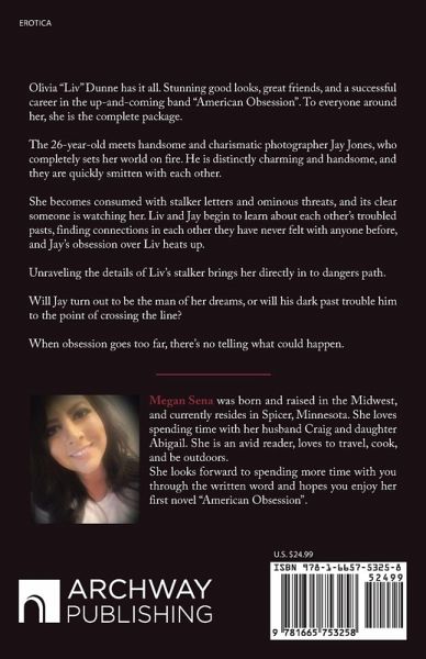 Olivia "Liv" Dunne has it all. Stunning good looks, great friends, and a successful career in the up-and-coming band "American Obsession". To everyone around her, she is the complete package. The 26-year-old meets handsome and charismatic photographer Jay Jones, who completely sets her world on fire. He is distinctly charming and handsome, and they are quickly smitten with each other. She becomes consumed with stalker letters and ominous threats, and its clear someone is watching her. Liv and Jay begin to learn about each other's troubled pasts, finding connections in each other they have never felt with anyone before, and Jay's obsession over Liv heats up. Unraveling the details of Liv's stalker brings her directly in to dangers path. Will Jay turn out to be the man of her dreams, or will his dark past trouble him to the point of crossing the line? When obsession goes too far, there's no telling what could happen.