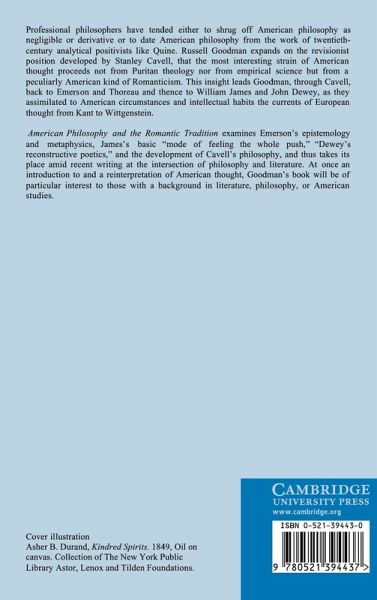 Professional philosophers have tended either to shrug off American philosophy as negligible or derivative or to date American philosophy from the work of twentieth-century analytical positivists such as Quine. Russell Goodman expands on the revisionist position developed by Stanley Cavell, that the most interesting strain of American thought proceeds not from Puritan theology or from empirical science but from a peculiarly American kind of Romanticism. This insight leads Goodman, through Cavell, back to Emerson and Thoreau and thence to William James and John Dewey, as they assimilated to American circumstances and intellectual habits the currents of European thought from Kant to Wittgenstein.