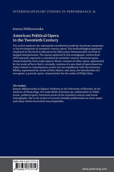 The author analyses the substantial contribution made by American composers to the development of twentieth-century opera. The methodological approach employed in this book is influenced by Mieczyslaw Tomaszewski's method of integral interpretation. The operas analyzed in this monograph, written from 1976 onwards, represent a watershed in twentieth-century American opera, characterised by three main aspects: firstly, creation of video-opera, represented by the works of Steve Reich, secondly, creation of a new kind of opera based on topics related to contemporary events that are manifested with documentary fidelity, represented by works of John Adams, and lastly, the introduction of a new genre: a portrait opera, characteristic for the works of Philip Glass.