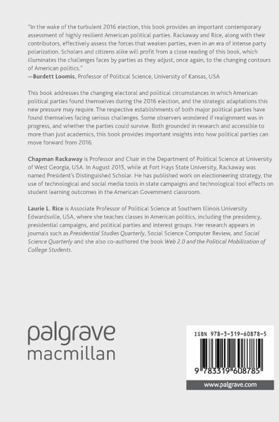This book addresses the changing electoral and political circumstances in which American political parties found themselves during the 2016 election, and the strategic adaptations this new pressure may require. The respective establishments of both major political parties have found themselves facing serious challenges. Some observers wondered if realignment was in progress, and whether the parties could survive. Both grounded in research and accessible to more than just academics, this book provides important insights into how political parties can move forward from 2016.