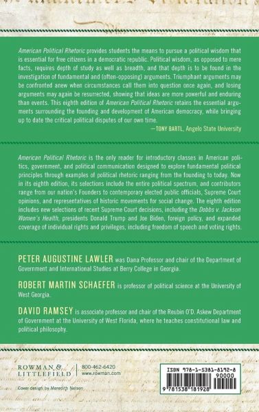In its eighth edition, American Political Rhetoric is the only reader for introductory classes in American politics and political communication that explores fundamental political principles through political rhetoric. Contributors include America's founders, modern public officials, Supreme Court opinions, and representatives of social movements.