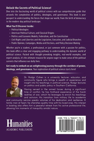 Unlock the Secrets of Political Science! Dive into the fascinating world of political science with our comprehensive guide that unravels the complexities of politics, ideologies, and governance. This book is your passport to understanding the forces that shape our world, from the birth of democracy to the modern-day political landscape. What You'll Discover Inside:Key Definitions in Political Science Political Ideologies American Political Culture Classical Origins of Western Political Ideologies Politics and Economic Models Federalism Civil Liberties and Rights The Legislative, Executive, and Judicial Branches Public Opinion, Campaigns, and Elections Media, Political Communications, and Interest Groups Domestic and Foreign Policy: Whether you're a student, a professional, or just someone with a passion for politics, this book offers a clear and engaging pathway to understanding the dynamic world of political science. Packed with thought-provoking insights, real-world examples, and expert analysis, it's the ultimate resource for anyone eager to make sense of the political currents that influence our daily lives. Get ready to embark on an enlightening journey through the corridors of power, ideology, and governance. Your exploration of political science starts here!