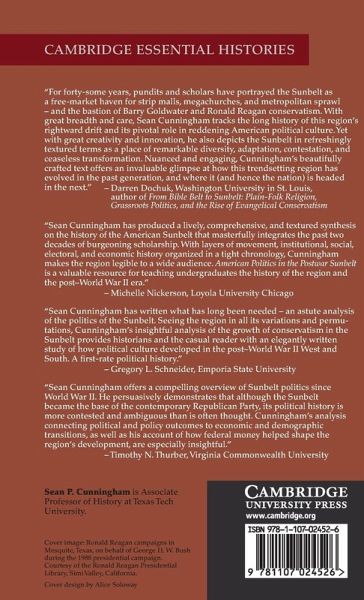 This book analyzes the political culture of the American Sunbelt since the end of World War II. It highlights and explains the Sunbelt's emergence during the second half of the twentieth century as the undisputed geographic epicentre for conservative Republican power in the United States. However, the book also investigates the ongoing nature of political contestation within the postwar Sunbelt, often highlighting the underappreciated persistence of liberal and progressive influences across the region. Sean P. Cunningham argues that the conservative Republican ascendancy that so many have identified as almost synonymous with the rise of the postwar American Sunbelt was hardly an easy, unobstructed victory march. Rather, it was consistently challenged and never preordained. The history of American politics in the postwar Sunbelt resembles a roller-coaster of partisan and ideological adaptation and transformation.