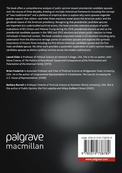 The book offers a comprehensive analysis of public opinion toward presidential candidate spouses over the course of three decades, drawing on multiple theoretical frameworks including the concept of "new traditionalism" and a plethora of empirical data to explore why some spouses engender greater support than others-and what these reactions reveal about the American public and the gendered nature of the American presidency. Recognizing that presidential candidate spouses are important but understudied political actors, this book provides extensive analysis of public evaluations of Bill Clinton and Melania Trump during the 2016 presidential election as well as the presidential candidate spouses in the 1992 and 2012 elections and places public reaction to these individuals in historical context. The book considers important trends in U.S. elections including party polarization from the distinctive vantage points of candidate spouses and explores the symbolic importance of historic firsts including the first African American candidate spouse and the first male candidate spouse. No other work provides a systematic exploration of public opinion towards candidate spouses as distinct political entities across the modern political era.
