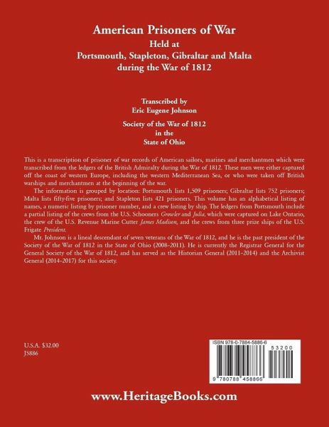 This is a transcription of prisoner of war records of American sailors, marines and merchantmen which were transcribed from the ledgers of the British Admiralty during the War of 1812. These men were either captured off the coast of western Europe, including the western Mediterranean Sea, or who were taken off British warships and merchantmen at the beginning of the war. The information is grouped by location: Portsmouth lists 1,509 prisoners; Gibraltar lists 752 prisoners; Malta lists fifty-five prisoners; and Stapleton lists 421 prisoners. This volume has an alphabetical listing of names, a numeric listing by prisoner number, and a crew listing by ship. The ledgers from Portsmouth include a partial listing of the crews from the U.S. Schooners Growler and Julia, which were captured on Lake Ontario, the crew of the U.S. Revenue Marine Cutter James Madison, and the crews from three prize ships of the U.S. Frigate President. Mr. Johnson is a lineal descendant of seven veterans of the War of 1812, and he is the past president of the Society of the War of 1812 in the State of Ohio (2008–2011). He is currently the Registrar General for the General Society of the War of 1812, and has served as the Historian General (2011–2014) and the Archivist General (2014–2017) for this society.