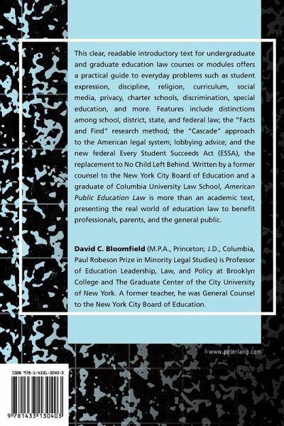 This clear, readable introductory text for undergraduate and graduate Education Law courses or modules offers a practical guide to everyday problems such as student expression, discipline, religion, curriculum, social media, privacy, charter schools, discrimination, special education, and more. Features include distinctions among school, district, state, and federal law; the Facts and Find research method; the Cascade approach to the American legal system; lobbying advice; and the new federal Every Student Succeeds Act (ESSA), the replacement to No Child Left Behind. Written by the ex-Counsel to the New York City Board of Education and a graduate of Columbia University Law School, American Public Education Law Primer is more than an academic text, presenting the real world of Education Law to benefit professionals, parents, and the general public.
