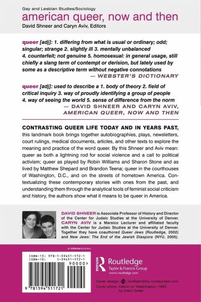 queer [adj]: 1 differing from what is usual or ordinary; odd; singular; strange 2 slightly ill; 3 mentally unbalanced 4 counterfeit; not genuine 5 homosexual: in general usage, still chiefly a slang term of contempt or derision, but lately used by some as a descriptive term without negative connotations --Webster's Dictionary queer [adj]: used to describe a 1 body of theory 2 field of critical inquiry 3 way of proudly identifying a group of people 4 way of seeing the world 5 sense of difference from the norm -- David Shneer and Caryn Aviv, Queer in America, Now and Then Contrasting queer life today and in years past, this landmark book brings together autobiographies, poetry, film studies, maps, documents, laws, and other texts to explore the meaning and practice of the word queer. By this Shneer and Aviv mean: queer as both a form of social violence and a call to political activism; queer as played by Robin Williams and Sharon Stone and as lived by Matthew Shepard and Brandon Teena; queer in the courthouses of Washington D.C. and on the streets of hometown America. Contextualizing these contemporary stories with ones from the past, and understanding them through the analytic tools of feminist social criticism and history, the authors show what it means to be queer in America.
